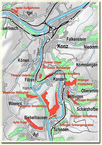 Kanzemer Sonnenberg: süd-südwestlich ausgerichtete Steillage am Saarkanal, mit einem hohen Anteil an feinen Schieferverwitterungsböden. Hier gedeihen feinfruchtige Rieslinge, die zu früher Reife gelangen.